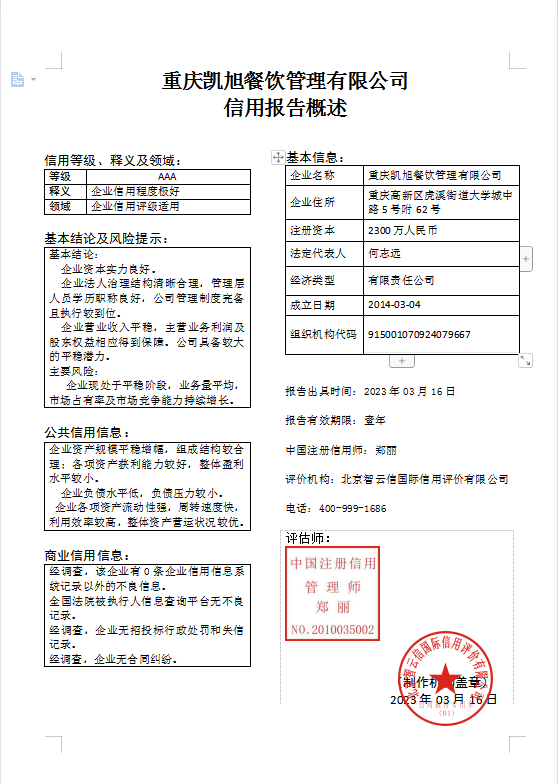 二、本信用證書和信用檔案是中立和中性的,它證明該單位已納入社會信用體系的監(jiān)督之中,任何組織和個人可以遵循誠信原則方便地對該單位進(jìn)行評價(表楊、批評、建議);任何組織和個人可以方便地查詢該單位良好信息、不良信息和整改信息。該單位也可以通過誠信經(jīng)營不斷增加信用分值和增加良好信用信息記錄,積累信用無形資產(chǎn)。三、根據(jù)該單位提供的相關(guān)資料,依據(jù)中華人民共和國信用行業(yè)標(biāo)準(zhǔn)Q/ZYX 002-2019《企業(yè)信用評價體系標(biāo)準(zhǔn)》,專業(yè)第三方信用評價機構(gòu)或信用認(rèn)證機構(gòu)對其信用等級評定為:AAA 級。四、提醒該信用檔案、信用證書及信用銘牌的使用者:請密切關(guān)注合作和交易對方的各項信用指標(biāo)或最新信用報告或年檢記錄信息,整體把握信用風(fēng)險,以保障合作和交易安全;請隨時關(guān)注合作和交易對方的信用動態(tài)變化或跟蹤評價報告,及時把握信用趨勢,以掌控商業(yè)風(fēng)險。信用是企業(yè)的生命線;信用檔案是企業(yè)信用評價結(jié)果的動態(tài)記錄,具有法律效力的信用證書是企業(yè)、商家及網(wǎng)站的第二“信用身份證”,信用檔案和信用證書是企業(yè)、商家及網(wǎng)站獲得客戶信任、促成合作和交易的基礎(chǔ),是大眾消費、合作和交易決策的重要依據(jù),是我國社會信用體系建設(shè)的公平保障體系。