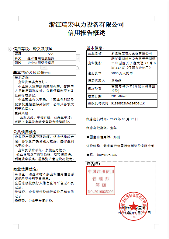 二、本信用證書和信用檔案是中立和中性的,它證明該單位已納入社會信用體系的監(jiān)督之中,任何組織和個人可以遵循誠信原則方便地對該單位進行評價(表楊、批評、建議);任何組織和個人可以方便地查詢該單位良好信息、不良信息和整改信息。該單位也可以通過誠信經(jīng)營不斷增加信用分值和增加良好信用信息記錄,積累信用無形資產(chǎn)。三、根據(jù)該單位提供的相關(guān)資料,依據(jù)中華人民共和國信用行業(yè)標(biāo)準(zhǔn)Q/ZYX 002-2019《企業(yè)信用評價體系標(biāo)準(zhǔn)》,專業(yè)第三方信用評價機構(gòu)或信用認證機構(gòu)對其信用等級評定為:AAA 級。四、提醒該信用檔案、信用證書及信用銘牌的使用者:請密切關(guān)注合作和交易對方的各項信用指標(biāo)或最新信用報告或年檢記錄信息,整體把握信用風(fēng)險,以保障合作和交易安全;請隨時關(guān)注合作和交易對方的信用動態(tài)變化或跟蹤評價報告,及時把握信用趨勢,以掌控商業(yè)風(fēng)險。信用是企業(yè)的生命線;信用檔案是企業(yè)信用評價結(jié)果的動態(tài)記錄,具有法律效力的信用證書是企業(yè)、商家及網(wǎng)站的第二“信用身份證”,信用檔案和信用證書是企業(yè)、商家及網(wǎng)站獲得客戶信任、促成合作和交易的基礎(chǔ),是大眾消費、合作和交易決策的重要依據(jù),是我國社會信用體系建設(shè)的公平保障體系。